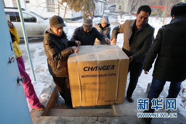 中国商人们驱车1个多小时来到位于吉尔吉斯斯坦首都附近的一个偏僻的孤儿院,将捐助的冰柜等物资搬进孤儿院大楼。