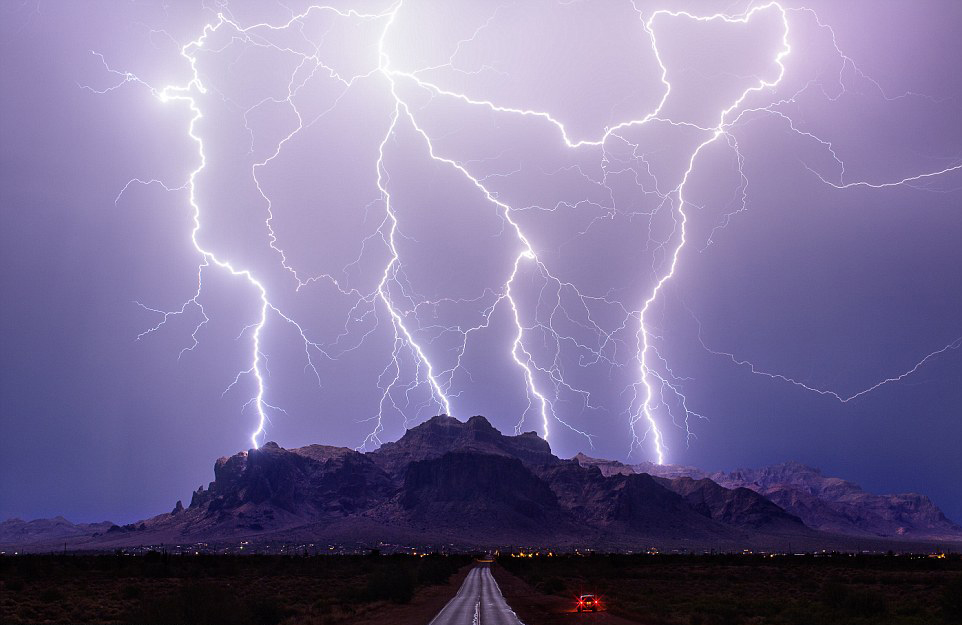 欧宾斯基说:“从抓拍极端天气和追逐风暴的角度来看,今年是令人雀跃的一年。我今年共看到4次龙卷风。在凤凰城(Phoenix)迷信山顶(Superstition Mountains)拍摄到的4道闪电,是我迄今为止拍摄到的最好闪电照片。”
