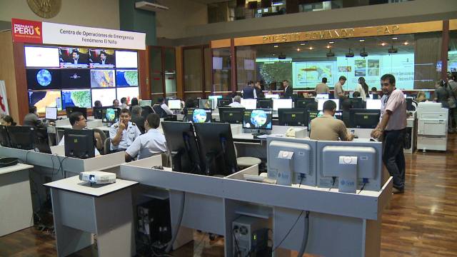 设在秘鲁国防部大楼里的“厄尔尼诺现象应急行动中心”是该国首个功能较为齐全的国家级联合指挥中心。由信息采集厅和决策指挥厅两部分组成。走进信息采集厅,墙壁上的大屏幕分领域显示着监控画面,工作台前,科研人员熟练而准确地操作着计算机,处理各个系统的数据。