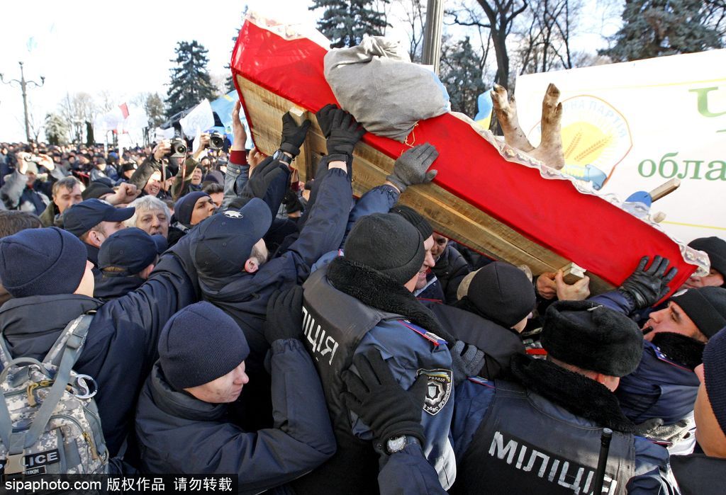 12月24日,乌克兰首都基辅爆发大规模农民示威抗议活动。抗议农民将死猪放入棺材中,象征着乌克兰农业的“死亡”。(图片来源:Sipa)