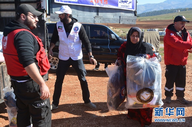 一叙利亚难民领取黎巴嫩慈善机构发放的过冬棉衣。新华社发(塔希尔摄)