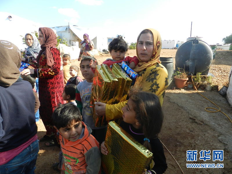 叙利亚难民儿童家长领取黎巴嫩慈善机构发给儿童的新年礼物。新华社发(塔希尔摄)