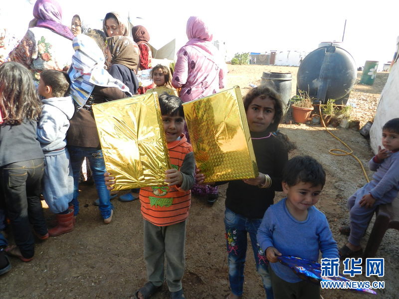 叙利亚难民儿童手举黎巴嫩慈善机构发给的新年礼物。新华社发(塔希尔摄)