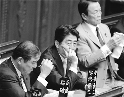 7月16日,日本首相安倍晋三听取在野党反对通过安保法案的讲话。
