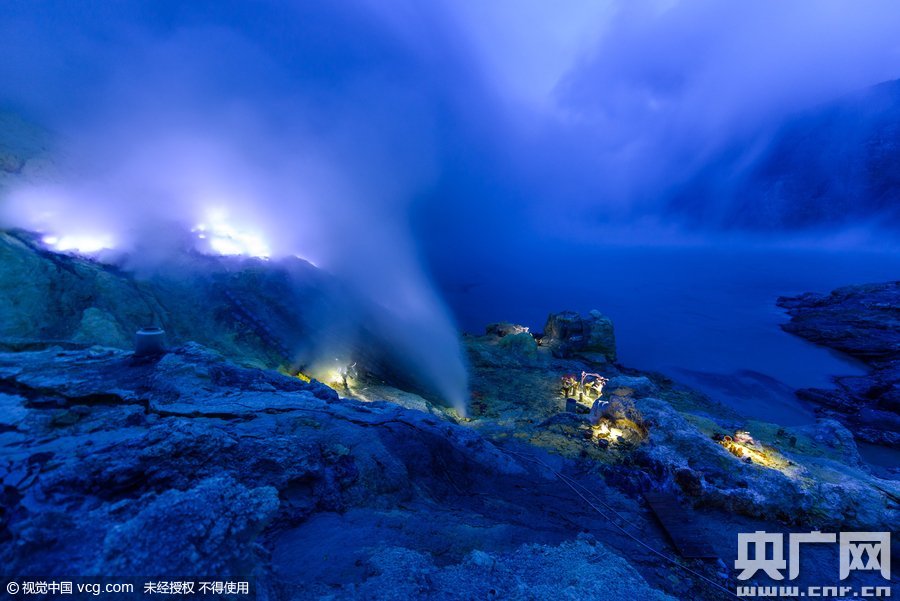 太阳落山后,火山口深处便会窜出一串奇怪的白光,从湖边缘流出温度极高的硫磺液体会骤然产生高达5米的蓝色火焰。