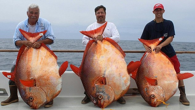 阿拉斯加州以出现各种罕见鱼类而闻名。图为上周一位渔民一次性捕到3条月亮鱼。(网页截图)