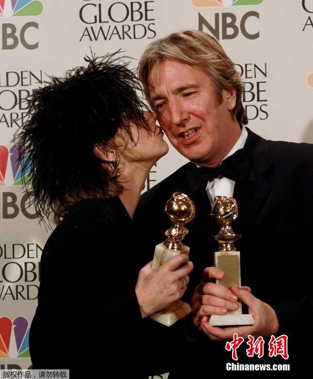 图为1997年1月19日,阿伦·瑞克曼(Alan Rickman)获得第54届金球奖时接受女演员海伦·米伦(Helen Mirren)的祝贺。