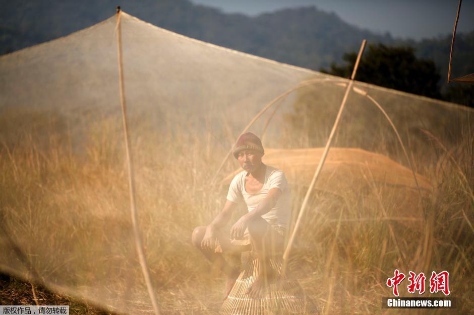 当地时间1月14日,印度古瓦哈蒂民众庆祝Bhogali Bihu丰收节,村民在湖中捕鱼。