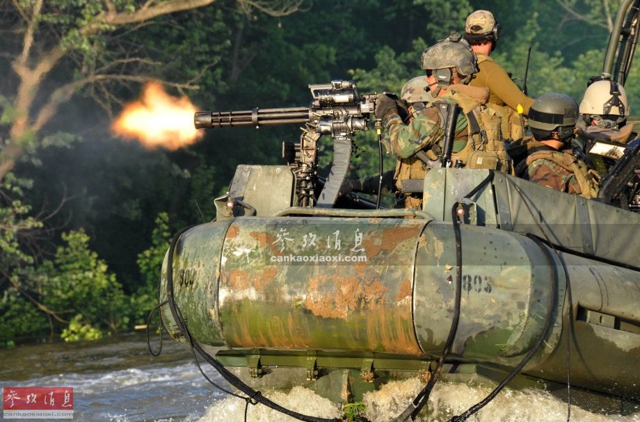 美军内河舟艇部队(RIVRON)士兵使用M134加特林速射机枪实弹演练。