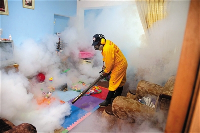 29日,在秘鲁利马省,一名工作人员用化学药剂驱蚊。寨卡病毒持续困扰美洲及加勒比地区。新华社发