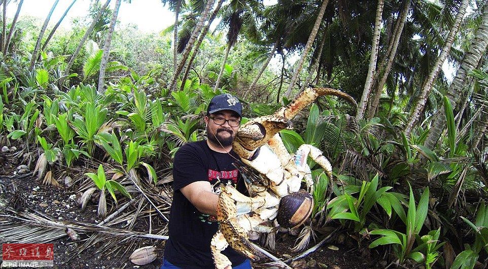 据英国《每日邮报》2月4日报道,一名游客在印度洋的圣诞岛上遇到一只巨大的椰子蟹,他还大胆地把螃蟹举起来拍照留念。椰子蟹是一种寄居蟹,体型硕大,体重最高可达6千克,是现存最大型的陆生节肢动物。椰子蟹的外壳坚硬,有两只强壮有力的巨螯,是爬树高手,尤其善于攀爬笔直的椰子树,因为它们可以用强壮的双螯剥开坚硬的椰子壳,以吃其中的椰子果肉而得名。