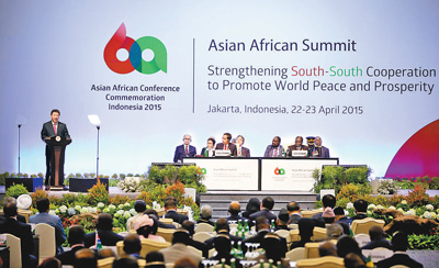图为:2015年4月22日,亚非领导人会议在印度尼西亚首都雅加达举行。国家主席习近平出席会议并发表题为《弘扬万隆精神推进合作共赢》的重要讲话。