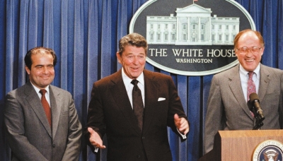 1986年6月17日,美国总统里根(中)提名斯卡利亚(左)为联邦最高法院法官。网络图片
