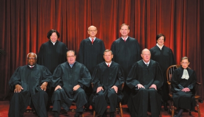 2010年10月8日,联邦最高法院9名大法官在最高法院大厅前合影留念。前排左二为斯卡利亚。图/美最高法院网站