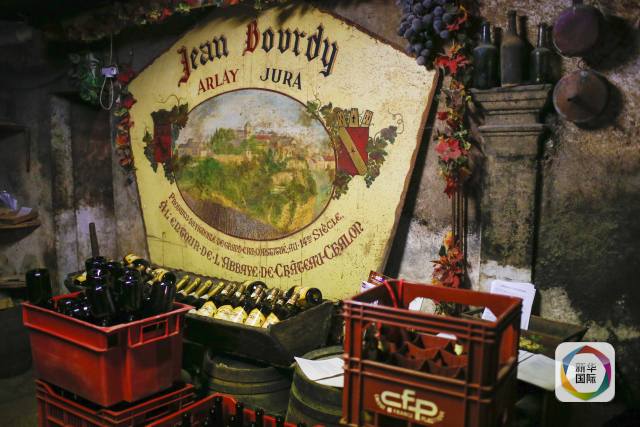 布尔迪家族的汝拉黄酒宣传画摆放在该家族的酒窖内。新华社记者周磊摄。