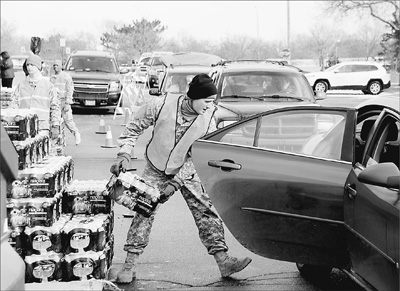 弗林特市一处消防站,国民警卫队员在分发瓶装水。