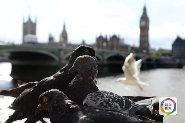 资料:2015年9月23日,英国伦敦泰晤士河畔的鸽子。(图片来源:新华/法新)