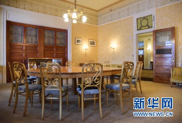 这是2月10日在美国新罕布什尔州布雷顿森林拍摄的华盛顿山饭店一层的“黄金室”。 新华社记者 鲍丹丹 摄