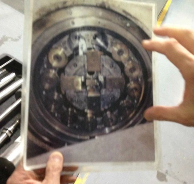 枪管冷锻机的内部照片,枪管毛胚插入一截刻有膛线的芯棒被四个锤头高频击打,毛胚在冷锻机内边旋转边前进。