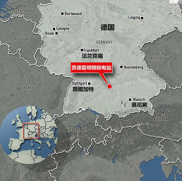 贡德雷明根核电站位于德国南部主要城市慕尼黑西北方向大约120公里处。