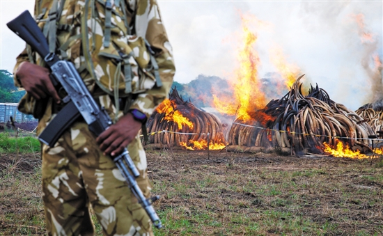 肯尼亚总统乌胡鲁·肯雅塔4月30日点火,焚毁了创纪录的105吨象牙,黑市估价超过1亿美元。