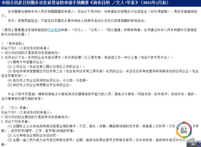 按照日本驻华大使馆的介绍,商务人士包括在国有大中型企业、上市企业、由日本上市企业投资的合资企业及子公司等、以及日本上市企业有频繁业务往来的企业等中“担任处长或经理以上职务”者,或者“连续工作一年以上者”。而文人、学者的范围则更加宽泛,有相当知名度的艺术家、人文科学、自然科学领域的学者、运动员、政府官员、大学正副教授、讲师等等都包括在内。