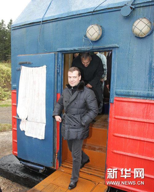资料:2010年11月1日,俄罗斯总统梅德韦杰夫(前)在南千岛群岛(日本称北方四岛)的国后岛视察。新华社/俄新社