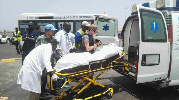 2016年6月1日,在塞内加尔达喀尔机场,马里维和部队遇袭事件中一名中国伤员抵达后被送上救护车。 新华社发