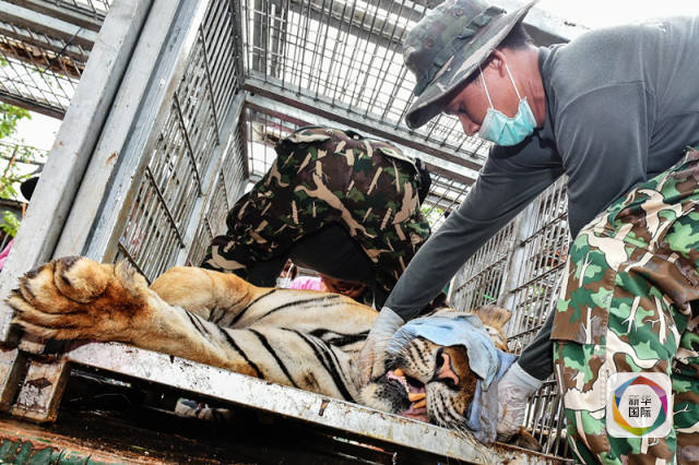 6月3日,在泰国西部北碧府,工作人员从涉嫌野生动物交易的帕朗塔布寺(“老虎庙”)中转移一只成年老虎。新华社记者李芒茫摄