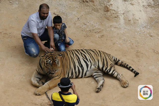5月30日,在泰国叻武里老虎庙,游客与老虎合影。