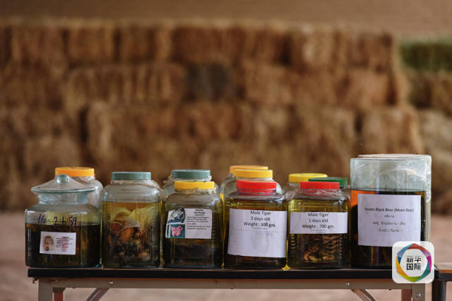 这是野生动物保护部门在泰国西部北碧府帕朗塔布寺(“老虎庙”)中搜查到的浸泡在化学药剂中的老虎幼崽及动物身体组织(6月3日摄)。新华社记者李芒茫摄