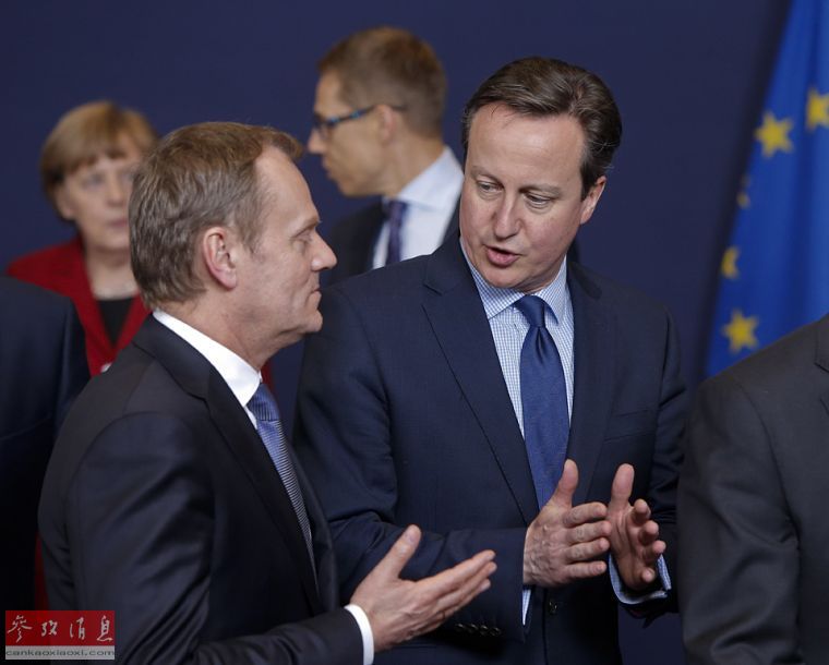 【讨价还价】2015年11月,卡梅伦就英国留在欧盟开出四大条件:一是确保欧洲共同市场对英国等非欧元区国家一视同仁;二是增强欧盟的竞争力,减少对成员国经济的束缚;三是允许英国不参与欧盟政治一体化进程,增强欧盟成员国议会的权力;四是控制欧盟进入英国的移民,限制欧盟移民在英国领取就业者福利的权益等。图为2015年3月19日,英国首相卡梅伦(右)与欧洲理事会主席图斯克在出席欧盟春季峰会期间的首脑合影时交谈。新华社记者周磊摄