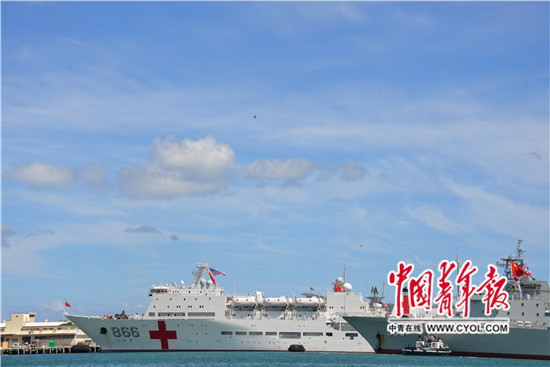 停靠在美国夏威夷珍珠港K8码头的和平方舟号、高邮湖号。中国青年报·中青在线驻美国记者 刘平/摄