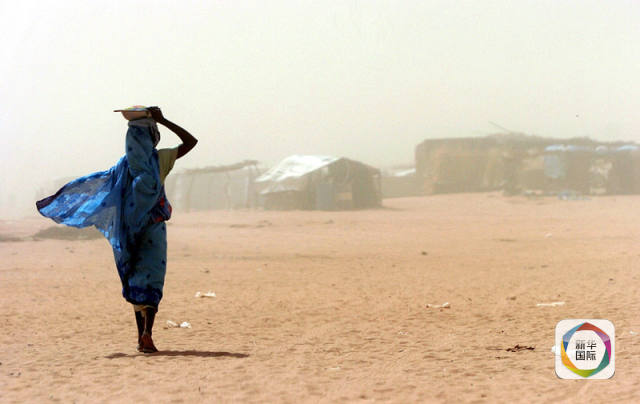 2006年1月21日,在苏丹西部的达尔富尔地区,一名身披蓝纱的少女在黄沙中穿行。新华社照片