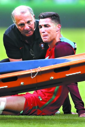 2016年欧洲杯决赛,C罗开场25分钟后难以坚持被担架抬出场,他不甘心地落泪。