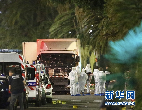 7月15日,在法国南部旅游城市尼斯,法国警察和法医在袭击现场工作。新华社/路透