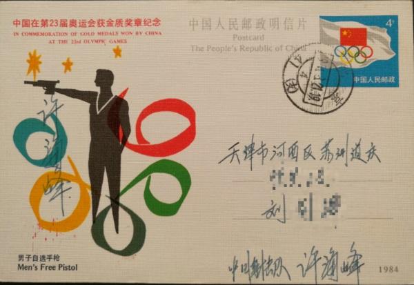 父亲后来告诉我,当时中国邮政为了纪念中国在奥运会获得金牌决定,每夺一枚金牌,接下来几天就会发行该枚金牌的纪念明信片。许海峰夺得第一枚金牌后,他就写好信,等发行明信片时,就买来候着。许海峰回国后,父亲就将信、明信片一起寄给他,请他签名后寄回留个纪念。