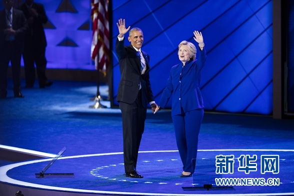 7月27日,在美国宾夕法尼亚州费城举行的民主党全国代表大会上,民主党总统候选人希拉里·克林顿(右)与总统奥巴马同台亮相。奥巴马27日在民主党全国代表大会上发表讲话,称赞希拉里·克林顿是最能胜任总统职位的候选人。他还将共和党总统候选人特朗普称为是对美国价值的一大威胁。 新华社记者 李木子 摄