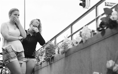 两名女子在德国慕尼黑奥林匹亚购物中心附近的一处地铁站哀悼枪击案中的受害者。新华社/法新