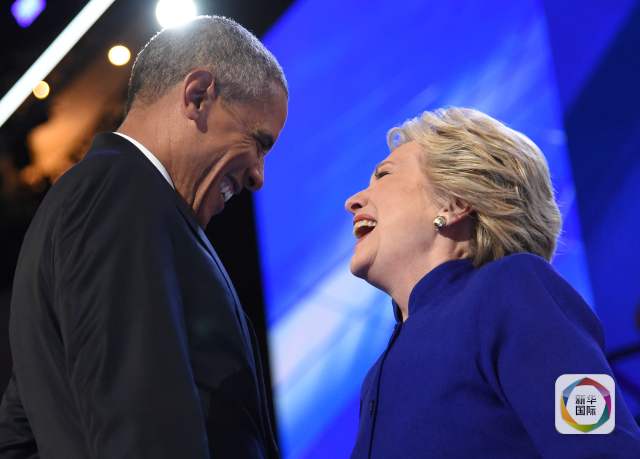 7月27日,在美国宾夕法尼亚州费城举行的美国民主党全国代表大会上,民主党总统候选人希拉里·克林顿(右)在总统奥巴马讲话后登台亮相。新华社/法新社