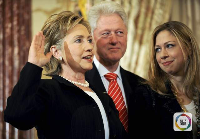 2009年2月2日,希拉里·克林顿(左)在丈夫、前总统克林顿(中)和女儿的陪伴下宣誓就任美国国务卿。新华社/路透社