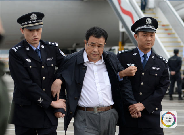 2015年5月9日,“红色通缉令”2号嫌犯李华波被押解下飞机。(新华社记者陈晔华摄)