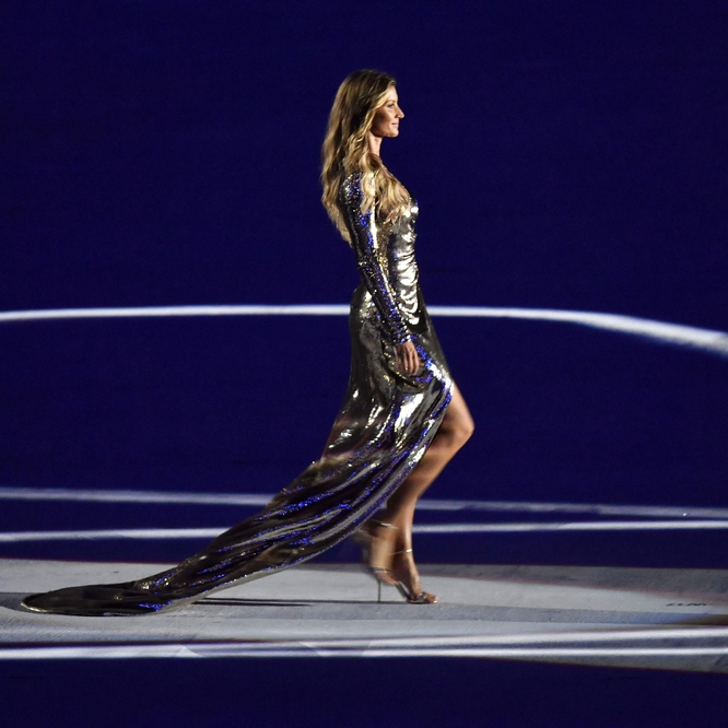 在开幕式现场,巴西超级名模吉赛尔·邦臣在100米的距离内向世界传递着巴西的性感。这是她模特生涯最后一次走秀,也是最震撼人心的一次。