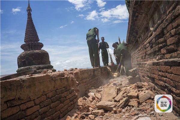 图为8月25日,在缅甸蒲甘,军方人员清理在地震中受损的佛塔。(新华社/美联)