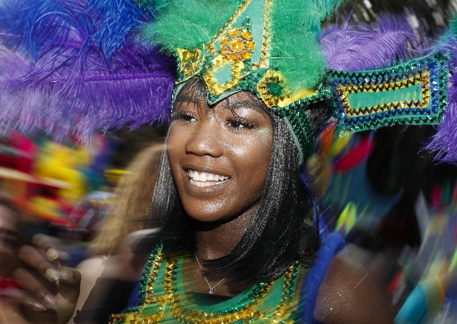 8月28日,一名表演者在英国伦敦西区举行的诺丁山狂欢节游行上跳舞。新华社记者韩岩摄