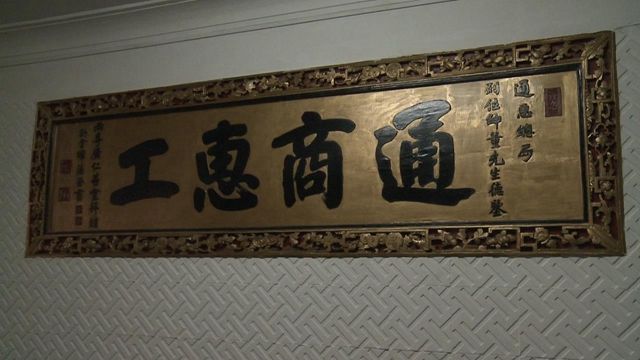 走进通惠总局一层大厅,墙上悬挂着的“复畴无私”匾额,黑底金字,两边的“义重合群”和“通商惠工”匾额,金底黑字,苍劲有力,浑厚醒目。对面依墙而立的供桌上摆放着祖宗牌位和清政府首任秘鲁公使郑藻如的像,牌位前端端正正地放着一个青花白瓷香炉。