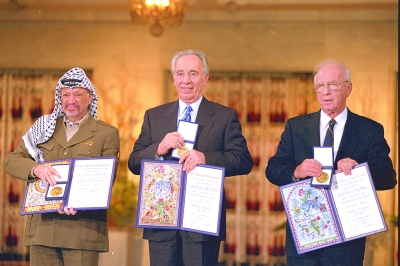 佩雷斯(中)与拉宾(右)和阿拉法特共同领取诺贝尔和平奖。王水平供图