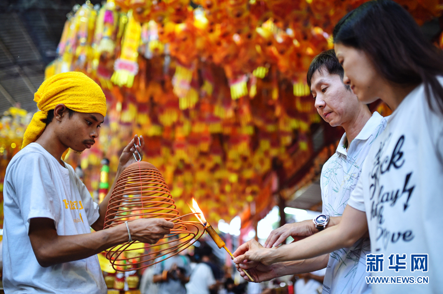 10月1日,在泰国曼谷唐人街一座中式庙宇举行的九皇斋节庆典中,两位市民(右)点燃盘香,向神明祈福。2016年10月1日是农历九月初一,泰国民众又迎来传统节日——九皇斋节。据介绍,农历九月初一是中国道教中被称为“九皇爷”的九位星君的寿诞日,人们通过前往庙宇祈福、上演“九皇戏”等各式庆典,表达对神明的敬意。由于人们从这一天起连续九天戒荤茹素,九皇斋节因而又被称为“素食节”。新华网记者 李芒茫 摄