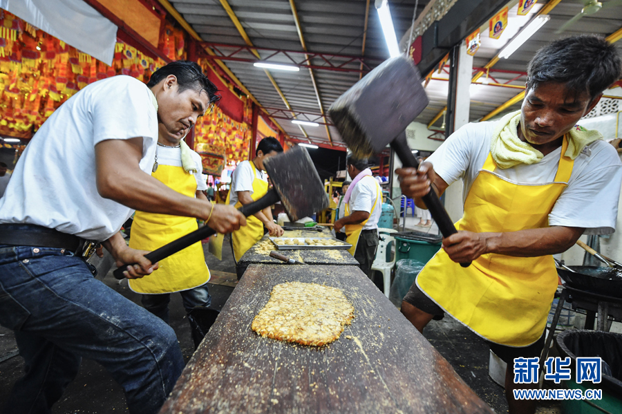 10月1日,在泰国曼谷唐人街一座中式庙宇中,两名工作人员使用木槌碾碎坚果,用以制作专门在九皇斋节供应的酥糖。2016年10月1日是农历九月初一,泰国民众又迎来传统节日——九皇斋节。据介绍,农历九月初一是中国道教中被称为“九皇爷”的九位星君的寿诞日,人们通过前往庙宇祈福、上演“九皇戏”等各式庆典,表达对神明的敬意。由于人们从这一天起连续九天戒荤茹素,九皇斋节因而又被称为“素食节”。新华网记者 李芒茫 摄