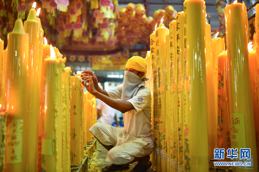 10月1日,在泰国曼谷唐人街一座中式庙宇举行的九皇斋节庆典中,一名工作人员在查看市民们供奉的蜡烛。2016年10月1日是农历九月初一,泰国民众又迎来传统节日——九皇斋节。据介绍,农历九月初一是中国道教中被称为“九皇爷”的九位星君的寿诞日,人们通过前往庙宇祈福、上演“九皇戏”等各式庆典,表达对神明的敬意。由于人们从这一天起连续九天戒荤茹素,九皇斋节因而又被称为“素食节”。新华网记者 李芒茫 摄